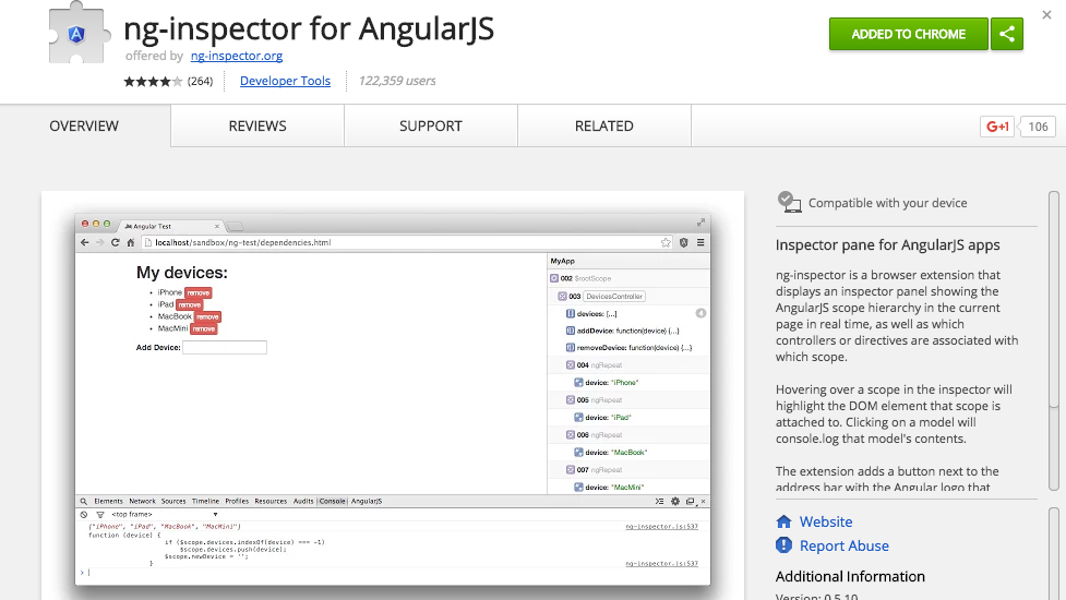 Ng-inspector adalah sebuah browser extension . Digunakan untuk inspect Angular applications pada scopes, model, function dan performances aplikasi.